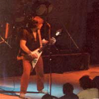 Live, Pete plays a Kahler equipped Gibson Flying ‘V’ with an Axon guitar synth, through a MESA Boogie rack setup with digital processing. He uses RFX, Palmer, Terratec, DigiTech, Orange and Vox equipment as well as Line6, Ibanez, Yamaha and bespoke guitars. Pete’s floorboard equipment is composed of midi controllers for the rack equipment.
